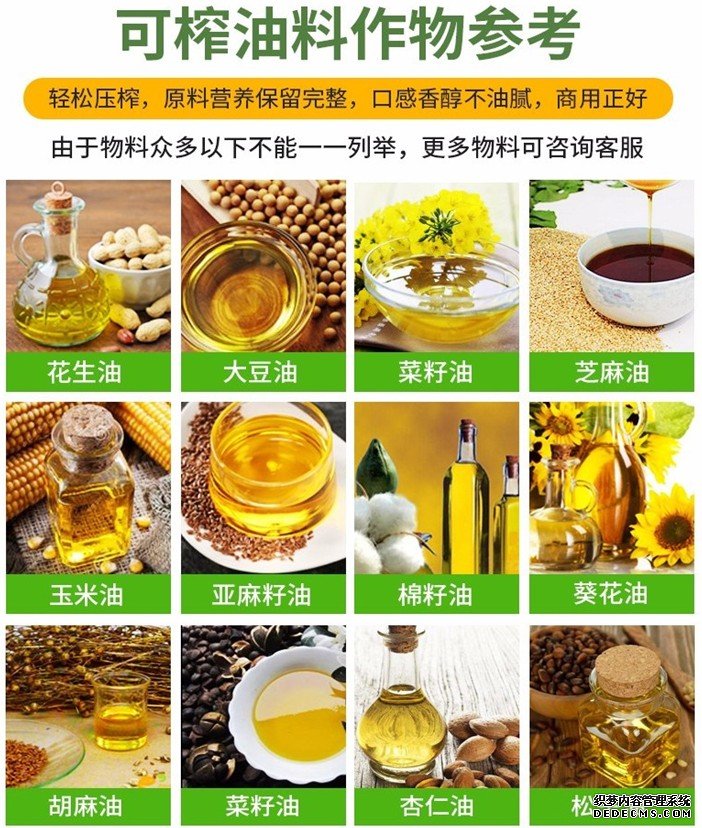 該設備可適用於菜籽、花生、茶籽、大豆、核桃、葵花籽等油料的生產加工,且壓榨出的油品綠色環保,對人體健康有益無害。購買此機後可長期穩定作業,對於中、小油廠和鄉鎮個體企業都很適用。